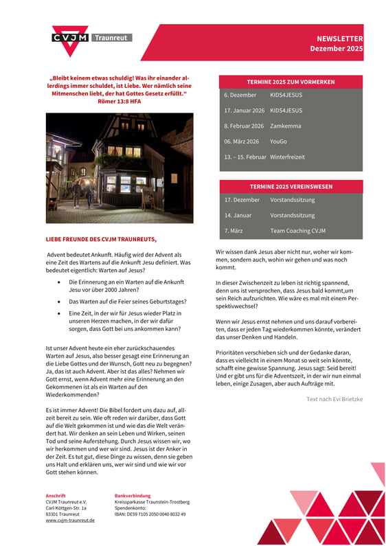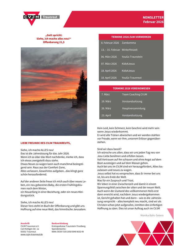 Datenschutzinfo: Wir tun nichts ohne Ihre Einwilligung. Für die Bearbeitung benötigen wir Ihren Namen und eine E-Mail Adresse zur Kontaktaufnahme. Bitte beachten Sie hierzu unsere Datenschutzerklärung. Hinweis: Sie können Ihre Einwilligung jederzeit für die Zukunft per E-Mail an datenschutz@cvjm-traunreut.de widerrufen. |