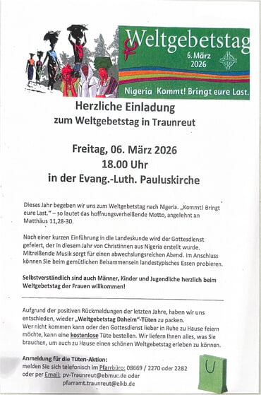 Auch in der Evang.-Luth. Pauluskirche laden wir herzlich ein, diesen besonderen Tag mit uns zu begehen. Die Gottesdienstordnung wird jedes Jahr von Frauen aus einem anderen Land vorbereitet. So lernen wir nicht nur eine neue Kultur kennen, sondern erfahren auch von den Hoffnungen, Sorgen und dem Glauben der Menschen vor Ort.